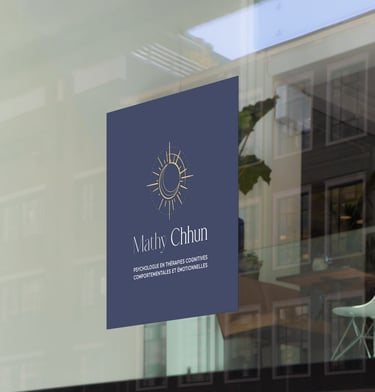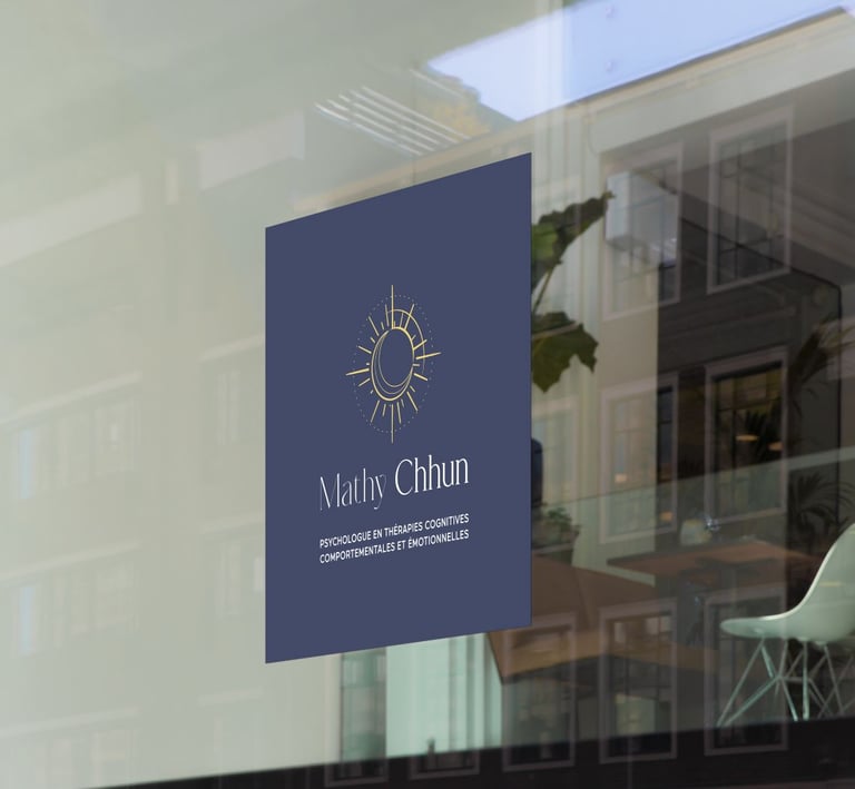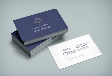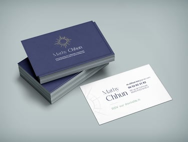 Logo et carte de visite pour Mathy Chhun, psychologue spécialisée TCC, basée à Mulhouse, France. Célébrant l'harmonie intérieure, ce logo fusionne subtilement le soleil et la lune, incarnant l'équilibre et la transformation. Les traits fins et les teintes apaisantes de bleu marine et de jaune pastel reflètent la douceur et la clarté des Thérapies Cognitivo-Comportementales.
