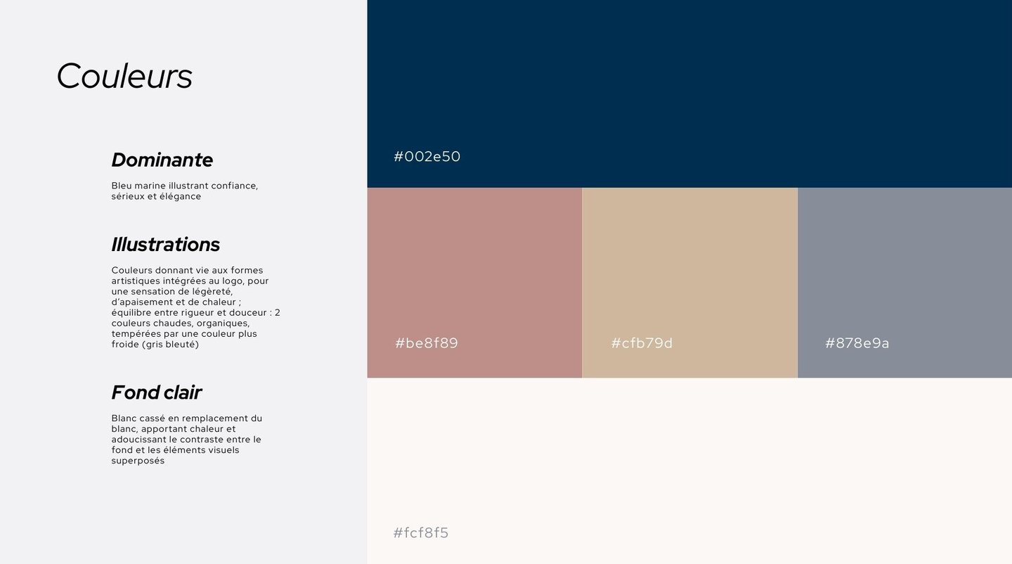 Représenter un visage formant l'aspect humain de sa profession centrée sur l'aide et l'échange. Le logo doit inviter à l'apaisement, avec finesse et élégance, tout en évoquant une signature. Il doit être expressif et mêler judicieusement abstraction et figuration afin de véhiculer une image artistique, et pour autant très concrète.